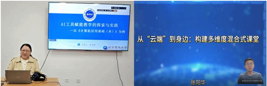 会议特邀两位优秀教师代表分享教学经验。怀柔分校邹青春老师分享了AI工具赋能教学的探索与实践。她阐述了AI技术的基本概念与发展现状,推荐了适用于教学场景的AI工具,并结合《计算机应用基础(本)》课程,详细演示了AI工具在备课、授课、学习支持等方面的具体应用实践,为AI与教学深度融合提供了具体范例。朝阳分校张阳华老师以“从‘云端’到身边:构建多维度混合式课堂”为题,介绍了在《计算机组成原理》混合式教学中的创新实践。他通过课前问卷学情分析、分层教学设计,搭配 “码农第一课:从废铁到开机” 线下实践活动,打破线上教学时空限制,强化师生情感链接,显著提升了学生学习兴趣与动力,整体教学成效显著。